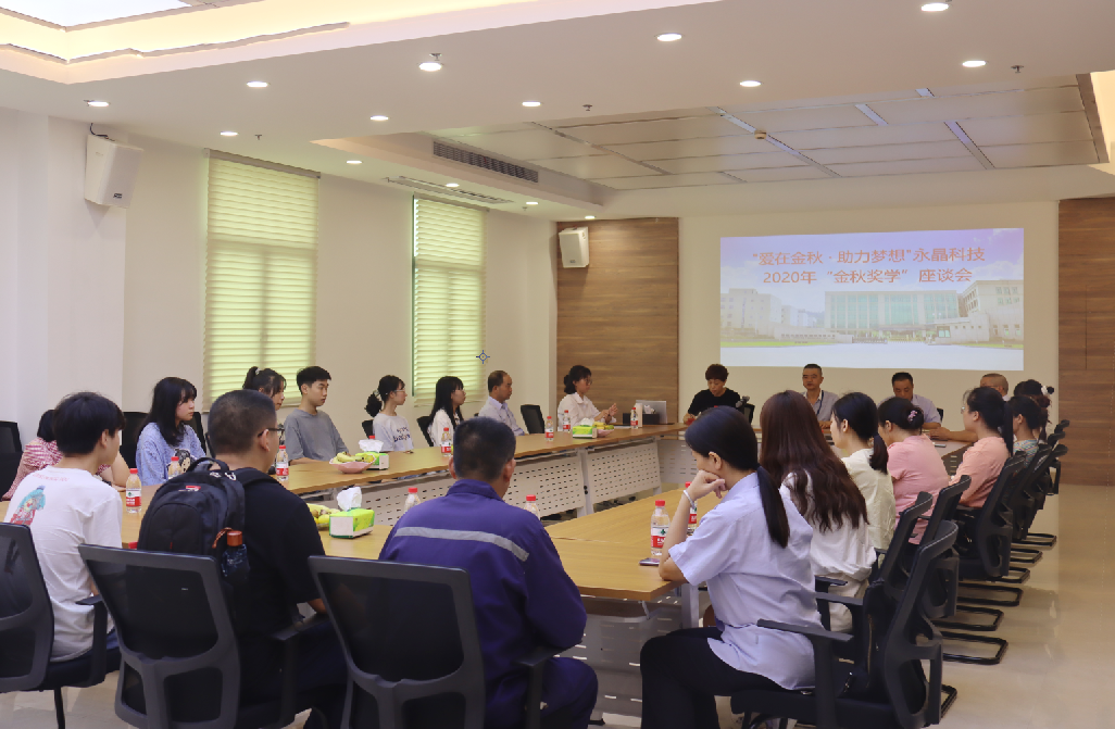 又是一年開學季,助學圓夢正當時。2020年9月14日,永晶科技工會組織召開“愛在金秋·助力夢想”2020年助學獎勵金發放座談會,向取得優異成績的職工子女致以誠摯的問候和美好的祝福。公司副總經理兼工會主席任清貴、工會副主席兼人力資源部部長洪勝財、大學新生及學生家長代表共計30余人參加了座談會。