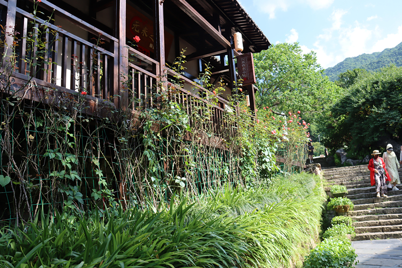 午后的陽光灑在飛檐翹角的古建筑上,溪水潺潺,燈籠輕搖,高空索道穿云破霧,扶搖直上。隨著海拔升高,視野豁然開朗。腳下是翻滾涌動的云海,如夢似幻;遠處是層巒疊嶂的翠峰,如詩如畫穿梭于云霧之中,宛如置身仙境!